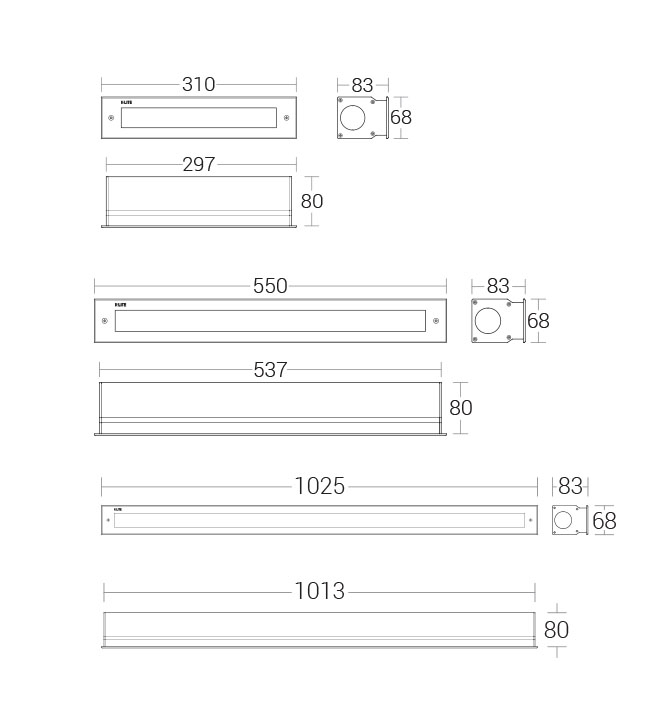 Linear recess mounted LED luminaires suitable for floor and wall applications which adds elegance to commercial, historical and modern architecture. Three different lengths are provided allowing the luminaire installation to be tailored as per the structure