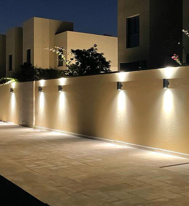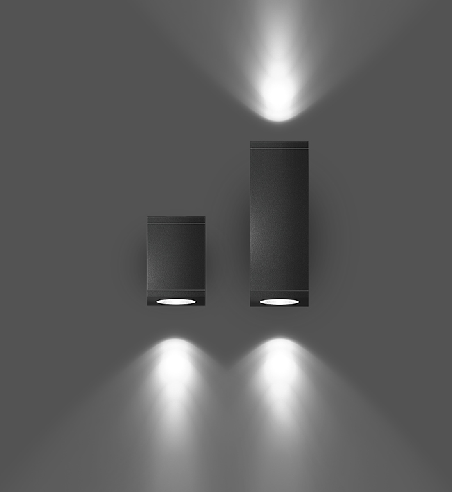 Facade luminaires with Hybrid optics, downwards for ambient lighting and orientation, upwards to accentuate architectural elements, Precise lighting for where it is required. Aesthetically shaped wall mounted luminaire with fully shielded light source for striking light effects.